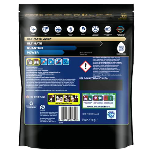 Sollte der Tab nicht in die Dosierkammer passen, lesen Sie die Gebrauchsanweisung Ihrer Geschirrspülmaschine oder konsultieren Sie Ihren Spülmaschinenhersteller. In Kurzspülgängen den Finish Power Classic Tab auf dem Boden des Geschirrspülers platzieren, idealerweise in der Nähe des Filters. Die integrierte Salzfunktion ist bei weichem/mittlerem und hartem Wasser bis zu 21 °dH wirksam. Wenn Ihr Wasser sehr hart ist, verwenden Sie zusätzlich Finish Spezial-Salz. Für die Verwendung in Haushalten mit Klärgrubensystemen geeignet. Diese Verpackung ist recycelbar. Bitte leere Verpackung im Recyclingmüll entsorgen. Verpackung nur restentleert der Wertstoffsammlung zuführen. Für optimale Trocknungsergebnisse empfehlen wir den Finish Glanz- & Klarspüler. Nicht empfohlen für die Verwendung mit echtem Silberbesteck.