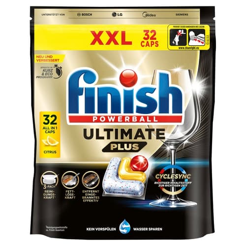 Finish Ultimate Plus Citrus Caps, für intensive Reinigung und Glanz schon beim 1. Spülgang.