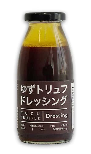 Zutaten: SOJAsauce (Wasser, SOJAbohnen, WEIZEN, Salz), Mirin (alc 12,5%) (Wasser, Dextrose, Reis, fester Maissirup), Ponzu (japan. Pon.-Zitrone, Zitronensäure), Yuzu-Su (Yuzu Frucht, Pomeranze, Zitronensäure), Traubenkernöl, Trüffelöl.