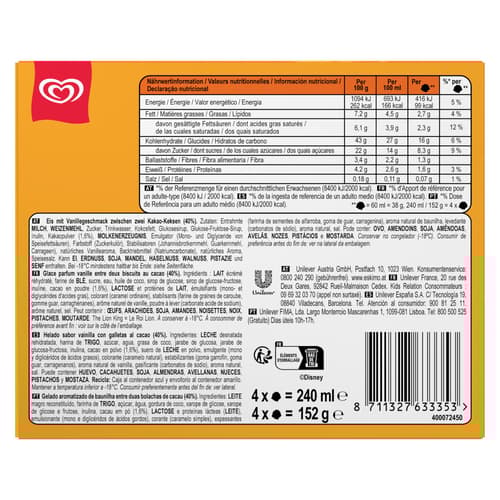 Eis mit Vanillegeschmack zwischen zwei Kakao-Keksen (40%).