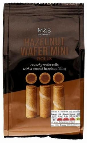 M&S tempting wafer rolls are filled with a rich hazelnut cream. They offer a delicious combination of crispy bite and nutty sweetness – perfect for an evening snack.
