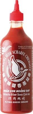 The popular seasoning sauce created in the Thai coastal town of Si Racha: Flying Goose Sriracha hot chilli sauce made from 70% sun-ripened chillies. For lovers of spicy cuisine, the extra hot Sriracha Sauce provides an intense spice and extra hot taste experience with selected ingredients.