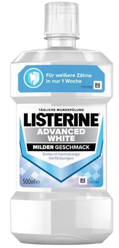 Recommended by dentists: when used twice a day, the LISTERINE® ADVANCED WHITE MILD FLAVOUR demonstrably solves tooth discoloration and prevents new occurrences - for white teeth in just 1 week. Powerful essential oils eliminate upto 97% of the plaque-causing bacteria. Cleans the tooth surface. Effective thanks to the double effect: eliminates stubborn tooth discolorations and prevents new discolorations. Non-abrasive whitening technology, that does not atffect the tooth enamel. Remineralizes and strengthens the teeth -- with fluoride.