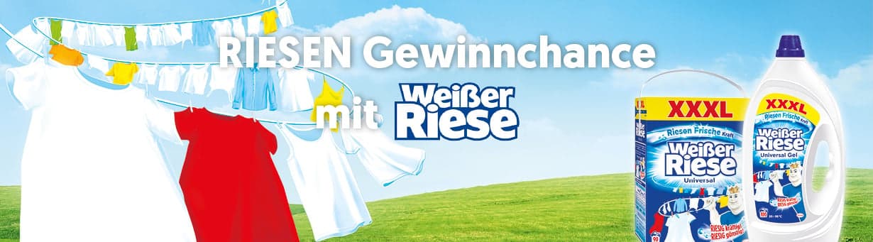 Ob als Gel, Duo-Caps oder Pulver – mit den Waschmitteln von Weißer Riese werden dank der hohen Ergiebigkeit Riesen-Wäscheberge wieder strahlend sauber. Und jetzt hast du auch die Möglichkeit mit dem Kauf von einem Weißen Riesen Produkt bei gurkerl.at riesig zu gewinnen!