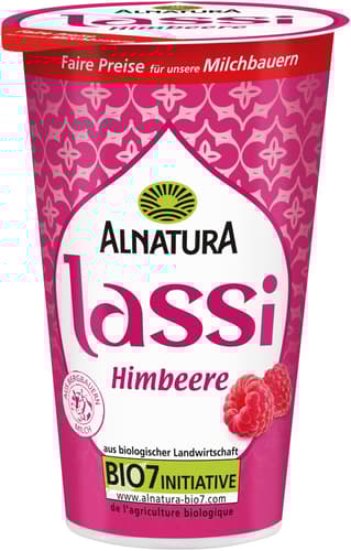 An organic yoghurt drink in the traditional Indian style, made from mountain farm milk. The fruity taste of the lassi comes exclusively from raspberry puree, flavourings are not added.
