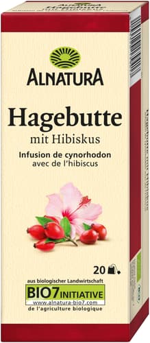Rose Hip Tea with hibiscus with a fruity-sour aroma. The fully ripe, pitted and cut rose hips of the dog rose and the fruit cups of the hibiscus are used for this Alnatura tea. It is characterized by a fresh, fruity, pleasantly sour aroma.