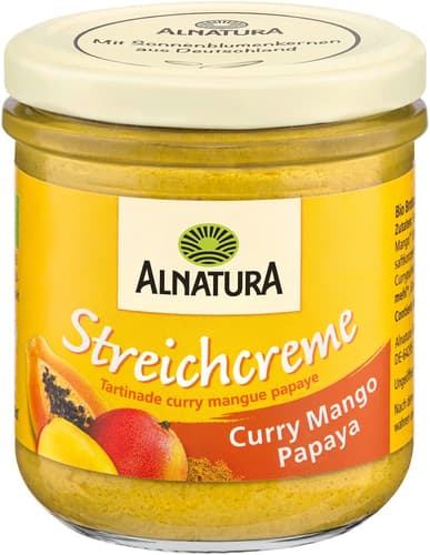 A vegan spread based on aromatic, finely ground sunflower seeds. Mango and papaya provide the fruity note of the spread, which is spicily seasoned with a curry spice mixture. The Alnatura Curry Mango Papaya Spread is not only delicious on bread, but also as a dip or sauce base. All agricultural ingredients are organic.