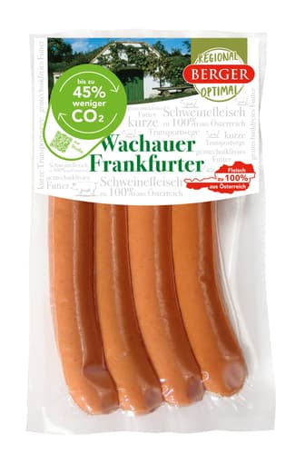 Die Wachauer Frankfurter werden aus dem Schweinefleisch des Regionalitäts- und Klimaschutzprogramms REGIONAL-OPTIMAL hergestellt. Frankfurter-Genuss regional.optimal! Die Wachauer Frankfurter überzeugen nicht nur durch ihre knackige Konsistenz, sondern auch durch ihre Zutaten, die im Rahmen des regional.optimal-Programms genauestens festgelegt sind.