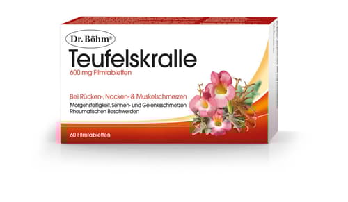 Dr. Böhm Teufelskralle 600 mg - Filmtabletten sind ein traditionelles pflanzliches Arzneimittel zur unterstützenden Behandlung von leichten Rücken-, Nacken- und Muskelschmerzen, Morgensteifigkeit sowie leichten Sehnen- und Gelenksschmerzen wie etwa in Knie, Hüfte oder Schultern und rheumatischen Beschwerden bei Erwachsenen.