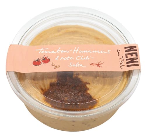 Zutaten: 96% Tomaten Hummus: 65 % Kichererbsen gekocht (Kichererbsen, Wasser), SESAMPASTE, Was-ser, 4 % Tomatenzubereitung (Tomaten, Speisesalz unjodiert, Säuerungsmittel: Citronensäure, Kon-servierungsstoff: Kaliumsorbat), Paprikawürfel, Olivenöl, Speisesalz jodiert (Salz, Kaliumjodid), Kräu-ter, Gewürze, Knoblauch, Antioxidationsmittel: Citronensäure, Konservierungsstoff: Kaliumsorbat. 4% Topping: Wasser, 25 % Paprikawürfel, Tomatenzubereitung (Tomaten, Speisesalz unjodiert, Säu-erungsmittel: Citronensäure, Konservierungsstoff: Kaliumsorbat), Koriander, Petersilie, Knoblauch, Olivenöl, Kreuzkümmel, Speisesalz jodiert (Salz, Kaliumjodid), 2 % Chili, Konservierungsstoff: Kaliumsorbat