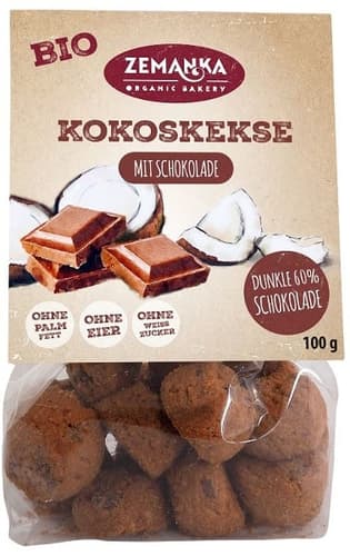 Zutaten: Weizenmehl, ungehärtetes Pflanzenfett (Sonnenblumenöl, Kakaobutter, Wasser, Emulgator: Sonnenblumenlecithin, Säureregulator: Zitronensäure), Rohrzucker, Kokosnuss 17%, dunkle Schokolade 8,7% (Rohrzucker, Kakaobutter - mindestens 60% Kakaogehalt in der Schokolade - Emulgator: Sonnenblumenlecithin), Weizenvollkornmehl, Kakao 3% Vanille-Aroma.