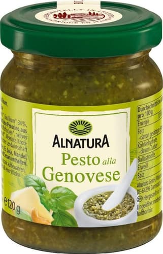 Aus Ligurien, wo Basilikum in duftenden Büschen wächst, stammt das Rezept für grünes Pesto. Aber auch bei uns hat es längst Karriere gemacht: perfekt als schnelle Pastasauce, als Extra-Würze in Gemüsesuppen, als Basis für Dips und pur auf dem Brot. Die Zutaten für Alnatura Pesto - natives Olivenöl extra, Nüsse, Hartkäse und 25 Prozent Basilikum – stammen aus Bio-Landbau.