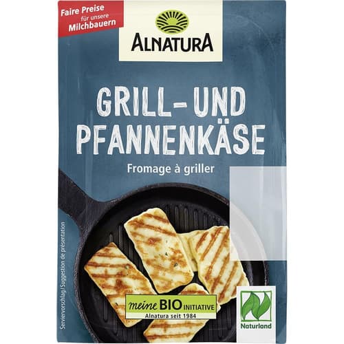 Ideal für Grill und Pfanne: Der Alnatura Griechischer Grillkäse Natur aus Kuh-, Schaf- und Ziegenmilch ist ein fester, mildwürziger Käse, der beim Erhitzen nicht schmilzt und sich dadurch sehr gut zum Grillen und Anbraten eignet. Kross zubereitet bringt er mit seinem typischen Quietschen beim Abbeißen Abwechslung auf den Teller und verfeinert beispielsweise Gemüsepfannen, Salate oder Ofengerichte. Der halbfeste Bio-Schnittkäse wird mit tierischem Lab hergestellt, in jeder Packung sind zwei Scheiben enthalten.