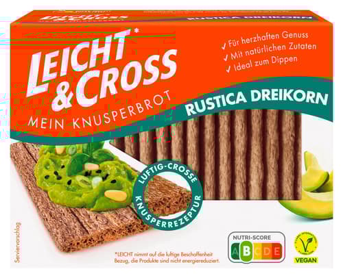 Leicht & Cross hat sich mit seinen knusprigen Brot-Alternativen etabliert und bietet verschiedene Sorten wie Roggen, Weizen und Vollkorn an. Die Produkte sind für ihren leichten und bekömmlichen Genuss bekannt und werden oft als vielseitige Unterlage für süße oder herzhafte Beläge beworben. Zum Sortiment gehören neben dem klassischen Knusperbrot auch "Häppy Crisps", knusprige Snacks auf Kichererbsenbasis.