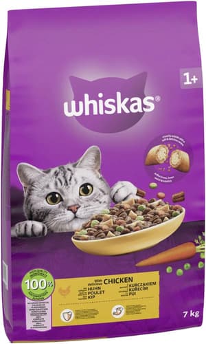 Verwöhnen Sie Ihre Katze mit Whiskas 1+ Trockenfutter mit Huhn. Dieses 100% komplette und ausgewogene Futter bietet ein optimales Verhältnis an Vitaminen und Mineralien für ein langes, glückliches Katzenleben. Es enthält leckere Knackits® – außen knusprig, innen weich – die zudem die Zahnpflege unterstützen. Angereichert mit Vitamin A für starke Sehkraft. Eine großzügige 7kg Packung aus der EU.