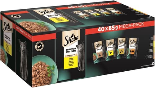 Das Sheba Selection in Sauce Geflügel Variation 4 Sorten Multipack besteht aus 40 Packungen je 85g.