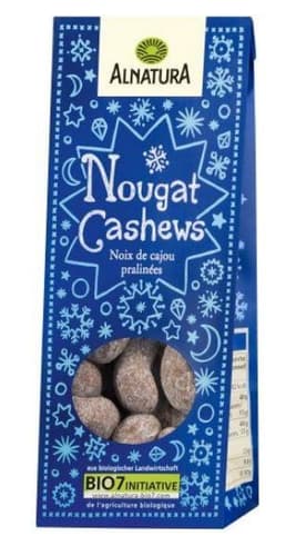 Zutaten: Vollmilchschokolade* 38 % (Rohrohrzucker*, Kakaobutter*,VOLLMILCHPULVER*, Kakaomasse*), CASHEWNÜSSE* geröstet 35 %, Nougat* 24%(Rohrohrzucker*, HASELNÜSSE* 22 %, Kakaomasse* Kakaobutter*),Rohrohrzucker* *aus biologischer Landwirtschaft. Kann Spuren von Gluten, Soja, Mandel und anderen Nüssen enthalten.