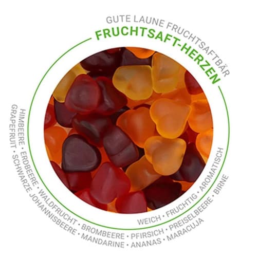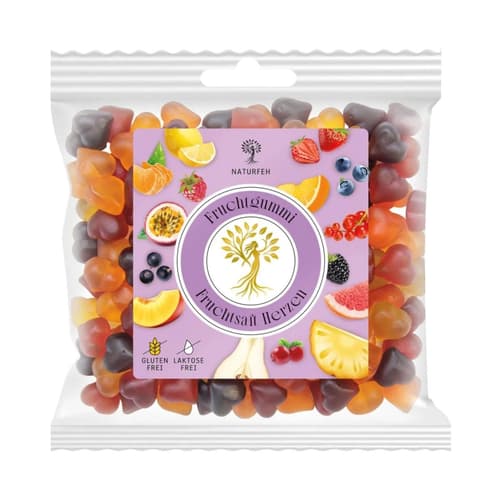 Gluten- & Laktosefreie Herzen ohne künstliche Farbstoffe und Aromen aus 12 verschiedenen Früchtesorten. Die Fruchtgummis bestehen zu 20% aus reinem, natürlichen Fruchtsaft - ohne umfruchten.