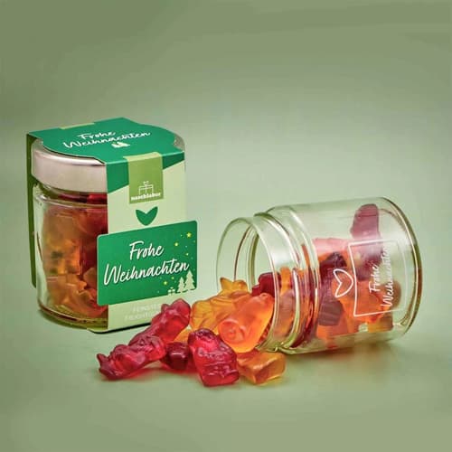 Das Geschenkglas Fruchtgummi Frohe Weihnachten bringt dir und deinen Liebsten eine leckere Abwechslung in der Adventszeit. Mit 120 Gramm köstlicher Fruchtgummis in festlichen Formen und den fruchtigen Geschmacksrichtungen Mandarine, Birne, Himbeere und Waldfrucht versüßt es das Warten auf Heiligabend. Die Fruchtgummis enthalten 20 % Fruchtsaft und kommen ohne künstliche Farbstoffe, Gluten und Laktose aus – so genießt du Qualität und Nachhaltigkeit in einem. Das wiederverwendbare Glas eignet sich ideal als Nikolausgeschenk, Adventskalenderfüllung oder kleine süße Aufmerksamkeit. Verschenke Genuss mit gutem Gewissen und Freude!