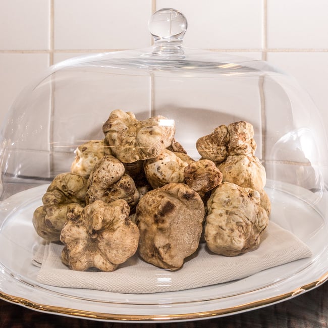 Die Farbe der weißen Trüffel reicht von weiß über hellbraun bis intensiv rosa, die Form kann rund wie auch unregelmäßig sein. Ihr einzigartiges, kräftiges Aroma ist nur schwer zu beschreiben. Die Alba Trüffel besitzt einen knoblauchverwandten Geruch, schmeckt aber wesentlich milder als ihr Aroma vermuten lässt. Erntezeit ist von September bis Dezember.