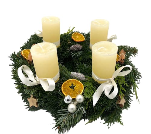 Der Kranz wurde aus ganz frischem Tannenreisig gebunden. Um ihn lange frisch zu halten, stellen Sie ihn bis zum 1. Advent so kühl als möglich.