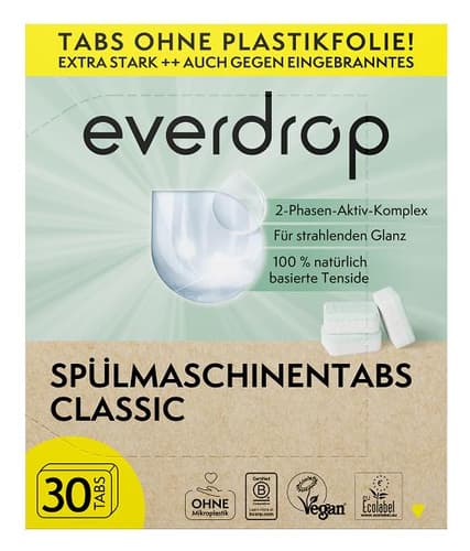 Auf eine strahlende Zukunft: Die everdrop Spülmaschinentabs sind 100% plastikfrei, vegan und reinigen mit 100% pflanzlich basierten Tensiden – kraftvoll und streifenfrei.