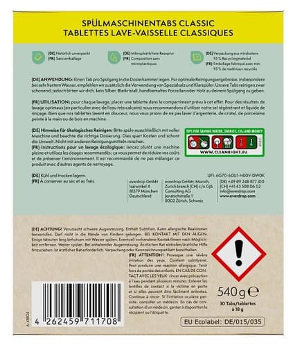 Denke an die Umwelt: Wähle ein Niedrigtemperatur-Programm und spüle mit voller Maschine. So reduzierst Du den Wasserverbrauch und verringerst die Wasserverschmutzung. Die Tabs pflegen zwar sehr schonend, jedoch bitten wir Dich kein Silber, Bleikristall, handbemaltes Porzellan oder Holz zu Deinem Spülgang zu geben.