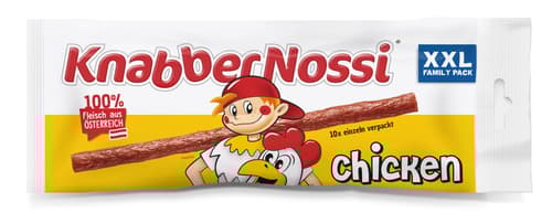 Bei Knabber Nossi, dem legendären Snack-Würstchen aus Österreich kommen auch Fans von mildem Hühnerfleisch ganz auf Ihre Kosten. Der super Geschmack ändert sich dadurch nicht und es gilt weiterhin: Wie immer, wo auch immer: Einfach aufreißen, reinbeißen ... und aufessen. Einzeln verpackt und super praktisch für Schultasche und Ausflugs-Rucksack. Egal, wo du bist, unterwegs oder zuhause: Lass dir's schmecken! Der praktische Vorteilspack enthält 10 Stück Knabber Nossi Chicken 12,5g und hält garantiert für viele gemeinsame Abenteuer.