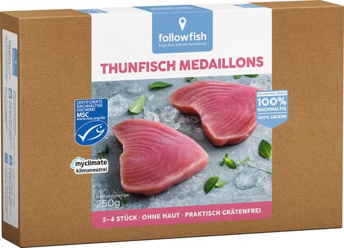 followfish MSC Thunfisch Medaillons250 gDieses Produkt ist nicht mehr im Angebot.Herkunftsland:nach dem aktuellen Angebotwende dich an den Kundenservice, um genaue Informationen zu erhalten