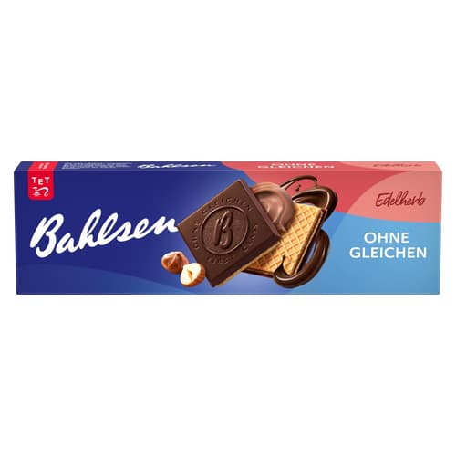 Marketing: Das knusprige Waffelgebäck ist eingelassen in ein Quadrat aus edelherber Schokolade und verfeinert mit einer Haselnusscreme mit gerösteten und fein gemahlenen Haselnüssen. Vier Schichten - präzise aufeinander abgestimmt. Ohne Zusatz von Farb- und Konservierungsstoffen. Mit Liebe, Hingabe - und Weizenmehl aus kontrolliertem Anbau.