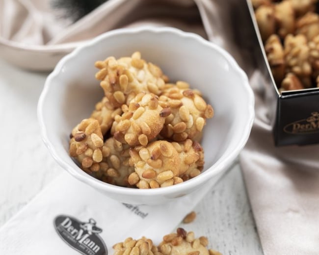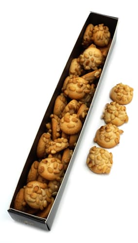 Marzipan, Zucker und Pinienkerne (Pignolie) geben dieser Bäckerei seinen hervorragenden Geschmack. Jetzt Neu: Palmfettfrei.
