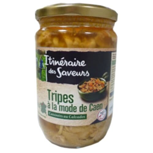 Zutaten: Rindermägen und -füße 83 %, Zwiebeln 7,6 %, Wasser, Karotten 4,4 %, Salz, Calvados 0,4 % (SULFITE), Gewürzextrakte, Lorbeerblatt.
