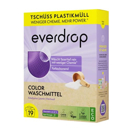 Colorwaschmittel für farbige Textilien, geeignet für Temperaturen von 20°C - 40°C. Inhalt 19 Waschladungen. Das neue everdrop Colorwaschmittel für bunte & dunkle Wäsche mit verbesserter Rezeptur! Es wäscht nachhaltiger und leistungsstärker als je zuvor – das beweist das EU Ecolabel. Gegenüber herkömmlichen ökologischen Waschmitteln kann es bei gleicher Leistung bis zu 40% geringer dosiert werden. Mit seinen Tensiden auf Basis pflanzlicher Rohstoffe wäscht es schon ab 20° C farbschonend und fasertief rein – und hilft so, Energie zu sparen. VORTEILE - farbschonend – wäscht fasertief rein - stärkere Leistung & bis 40% geringere Dosierung* - waschaktiv schon ab 20° C - vegan & ohne Mikroplastik - Hautverträglichkeit von Dermatest "sehr gut" - Duft: Grapefruit, Patchouli, Apfelblüte *ggü. herkömmlichen ökologischen Waschmitteln IMPACT Die Inhaltsstoffe sind 100% vegan, frei von Mikroplastik und leicht biologisch abbaubar. Die Papierverpackung besteht aus mind. 95% Recyclingmaterial und ist vollständig im Altpapier recycelbar. Wie alle everdrop Produkte kommt also auch das Colorwaschmittel komplett ohne Plastikmüll aus!