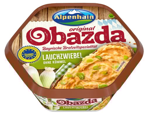 Der cremigherzhafte Alpenhain Original Obazda Lauchzwiebel eignet sich wie das Original als Brotaufstrich, lässt sich aber auch zum Verfeinern von kalten und warmen Snacks und Gerichten einsetzen.