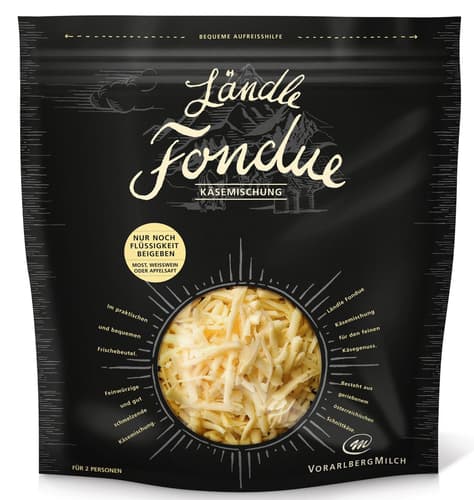 Die Ländle Fondue Käsemischung für den feinen Fonduegenuss. Besteht aus geriebenem österreichischen Schnittkäse und ist eine würzige und gut schmelzende Käsemischung im praktischen und bequemen Frischebeutel.