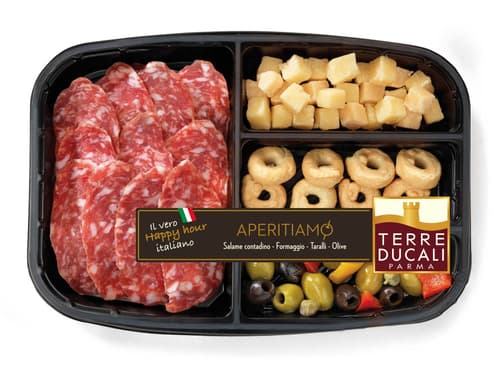 Zutaten: Salami 33%. (Schweinefleisch, Speisesalz, naturliche Aromen, Dextrose. Antioxidationsmittel: Natriumascorbat, Konservierungsstoff: Kaliumnitrat, Natriumnitrit). gereifter Käse 27% (MILCH. Salz, mikrobielles Lab), gemischte Oliven 27% (entsteinte grüne und schwarze Oliven in unterschiedlichen Anteilen Sonnenblumenöl rote und gelbe Paprika, Kapern, Salz. Gewürze (Knoblauch, Rosmarin, Pfeffer. Chilischote), Weißweinessig, Säureregulator: E270 und E330 Antioxidationsmittel: E300 Farbstabilisator E579). mögliche Präsenz von Kernen, im Ofen gebackene Grissini 13%
