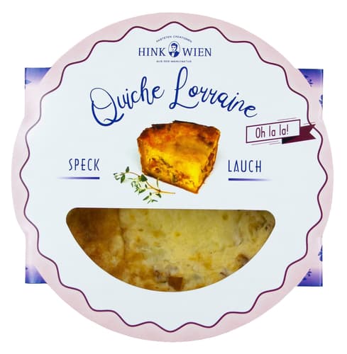 Backofen vorheizen, Quiche aus Schale nehmen und bei ca. 160°C Heißluft 20 Minuten knusprig backen.