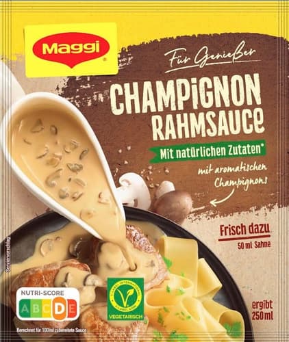 Die geschmacklich fein abgestimmte Sauce mit leckeren Champignons und frischer Sahne passt ideal zu kurzgebratenem wie Steaks, Schweinemedaillons oder Schnitzel, Fleischlaibchen und Geschnetzeltem.
