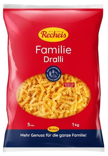 Recheis Familie Dralli sind der Klassiker unter den Nudeln und für nahezu jedes Lieblingsgericht passend. Die spiralförmige Struktur sorgt dafür, dass noch mehr Sauce aufgenommen werden kann und nichts vom leckeren Sugo am Teller zurückbleibt.