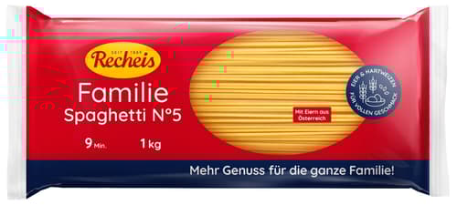 Mit „Familie“ werden die besonders beliebten Nudelformen in der praktischen Familien-Großpackung angeboten. Speziell für Familien und ganz große Nudelfans, werden diese Nudeln aus den besten Zutaten hergestellt. Dass Kinder sich ihre Speisen gerne aussuchen und nicht alles für Gut heißen, was auf den Teller kommt, kennt wahrscheinlich jede Mama und jeder Papa. Bei Spaghetti von Recheis kann jedoch keiner widerstehen. Gemeinsam mit einem klassischem Fleisch- oder Gemüsesugo gehen Spaghetti immer.