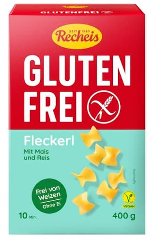 Recheis Glutenfrei Fleckerl sind zu 100% frei von Weizen und somit ideal für alle, die auf eine glutenfreie Ernährung Wert legen. Innovative Verfahren sowie ausgesuchte Mais- und Reissorten sorgen dafür, dass Recheis Glutenfrei Nudeln aussehen wie herkömmliche Nudeln. Auch ihr voller Geschmack und der gute Biss machen diese Nudeln zu einer weizenfreien Abwechslung.