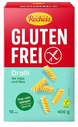 Recheis Glutenfrei Dralli sind zu 100 % frei von Weizen und somit ideal für alle, die auf eine glutenfreie Ernährung Wert legen. Innovative Verfahren sowie ausgesuchte Mais- und Reissorten sorgen dafür, dass Recheis Glutenfrei Nudeln aussehen wie herkömmliche Nudeln. Auch ihr voller Geschmack und der gute Biss machen diese Nudeln zu einer weizenfreien Abwechslung.