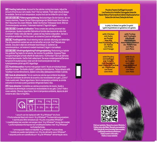 Fütterungsempfehlung: 1 Portionsbeutel lässt sich durch 16 g WHISKAS® Trockennahrung ersetzen. Berücksichtigen Sie die Kalorien, die von Snacks stammen. Fütterungsmengen sind nur als Richtlinien gedacht. Passen Sie die Fütterungsmenge entsprechend dem Alter, der Grösse und der Aktivität Ihrer Katze an. Verteilen Sie die Fütterungsportionen über den Tag hinweg. Für ausführlichere Informationen besuchen Sie bitte unsere Website. Stellen Sie frisches Trinkwasser bereit. Bitte bei Zimmertemperatur servieren. Futterreste maximal 2 Tage kühl lagern.
