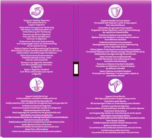 Fleisch und tierische Nebenerzeugnisse (35%, u.a. 4% Huhn im Häppchen*), Getreide,