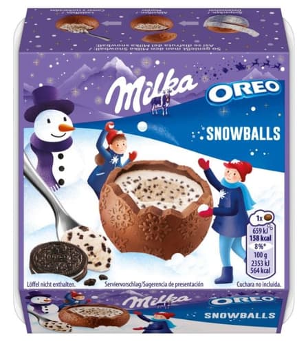 Milka Snowballs Oreo sind runde Schokoladenkugeln aus Alpenmilchschokolade mit einer cremigen Milchfüllung. In der Füllung befinden sich kleine Stücke von Oreo-Keksen.