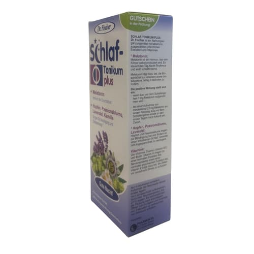 SCHLAF-TONIKUM PLUS Dr. Fischer ist ein Tonikum mit Melatonin, einem Pflanzenextrakt aus Passionsblume, Hopfen, Lavendel und Kamille sowie ausgewählten Vitaminen.