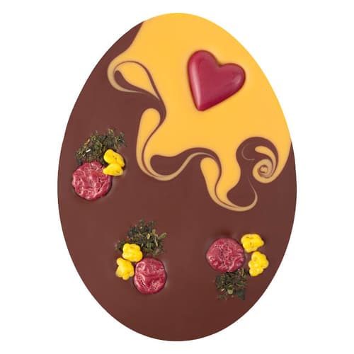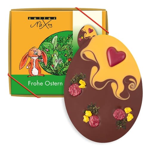 Ein Schokoei aus Milchschokolade und fruchtiger Marillenkuvertüre. Geschmückt mit einem roten Himbeer-Schokoherz, Kokosflocken, gerösteten Kürbiskernen umhüllt von weißer Schokolade und knusprigen Himbeer-Schokoflakes. Die bunten Farben entstehen natürlich nur aus echten Früchten und Beeren. Verpackt in einer schönen Ostergeschenkbox.