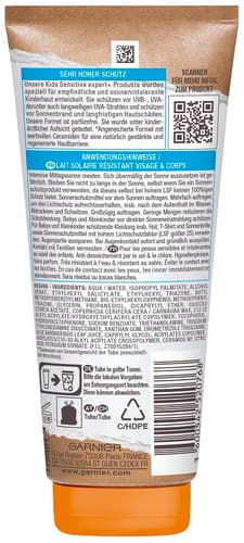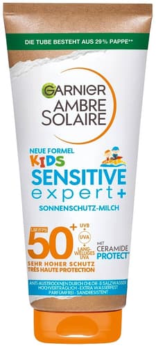 Thanks to the Garnier Ambre Solaire Kids Sensitive expert+ sun milk with sun protection factor 50+, sensitive children's skin is effectively protected from the damaging effects of UVA/UVB radiation. The sun care is waterproof and prevents sensitive children's skin from drying out due to salt water and chlorine. The sun milk is gentle on the skin and absorbs quickly without greasing. Therefore, the sun milk does not stick and leaves no residue on the skin. In addition, it cares for even sensitive children's skin and ensures that it is soft and supple. The tube is also made of 29% sustainable cardboard.