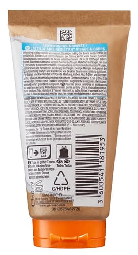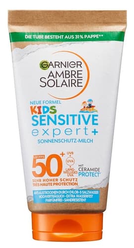 Empfindliche Kinderhaut erhält mit der Garnier Ambre Solaire Kids Sensitive expert+ Sonnenschutz-Milch mit Lichtschutzfaktor 50+ einen besonderen Infrarot-Schutz vor den schädigenden Auswirkungen von UVA-/UVB-Strahlung. Die Sonnenpflege zeichnet sich durch eine sehr gute Lichtstabilität aus und ist zugleich extra wasserfest. Darüber hinaus wirkt die Sonnenschutz-Milch für Kinder einem Austrocknen durch Salzwasser und Chlor entgegen. Die schnell einziehende Formel zieht schnell in die Haut ein, ohne zu fetten und zu kleben und ist ebenfalls resistent gegen Abrieb durch Sand. Dank der praktischen Reisegröße eignet sich die Sonnencreme optimal für unterwegs.