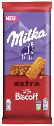 Zartschmelzende Milka Alpenmilchschokolade mit knusprigen, karamellisierten Lotus Biscoff‑Keksstückchen – für einen angenehmen Mix aus Creme und Crunch.